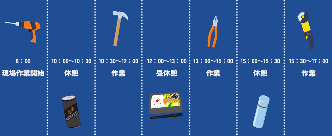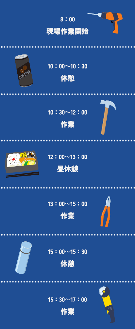 勤務時間 | 8:00~17:00(現場により異なる) |